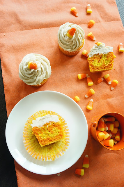 This is a super easy cupcake you can make for your upcoming Halloween party. Don't worry they don't taste like candy corn....that may be a bit much. You use a box cake mix and just add food coloring. I used my favorite buttercream, but you can definitely use store bought frosting. Throw a few candy corn on top and you are set! I was bummed that mine didn't look exactly like candy corn. All of the cupcakes I saw on the Interwebs were perfect! So here's a less than perfect version to make us all feel better.